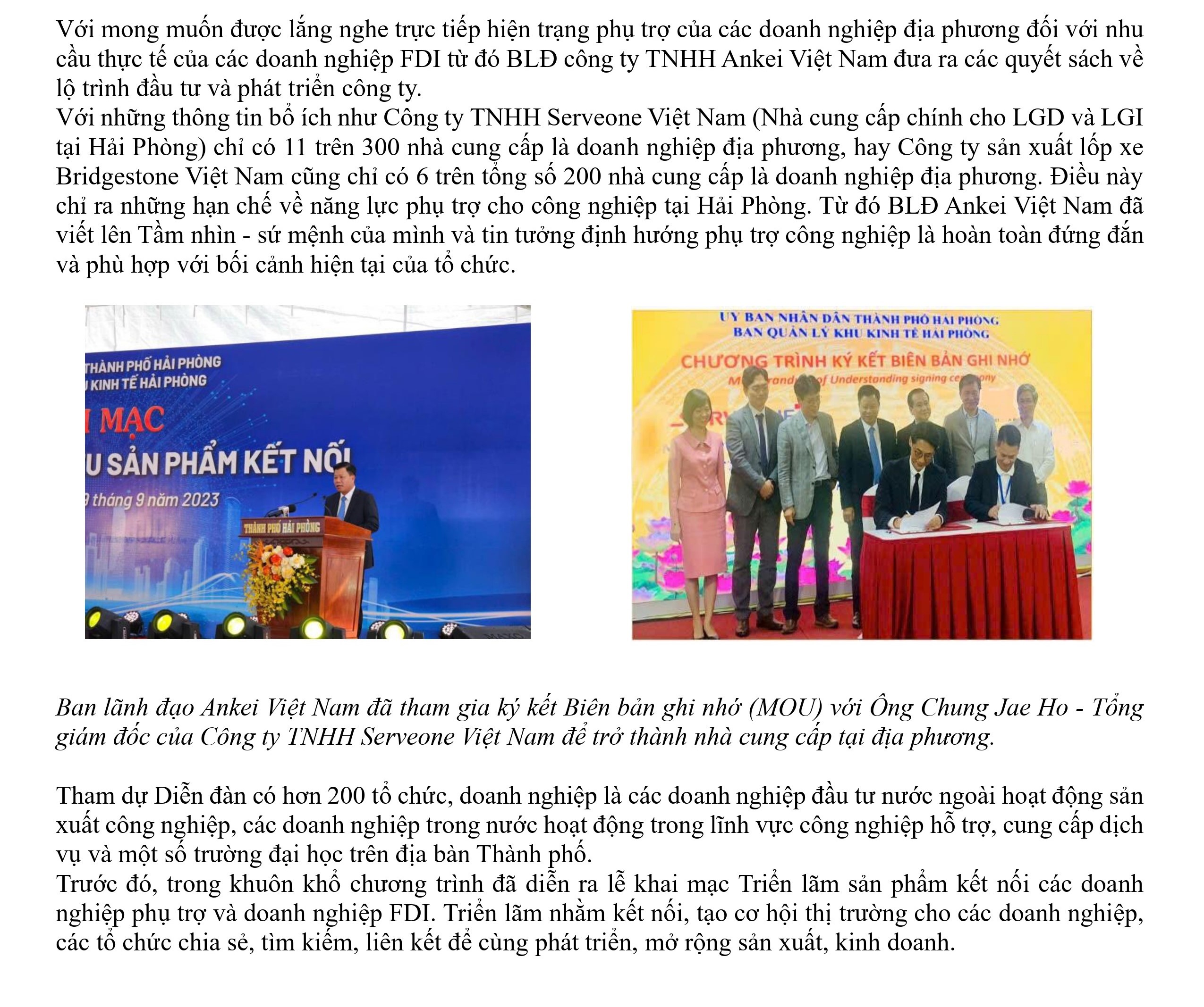 BAN LÃNH ĐẠO ANKEI VIỆT NAM THAM DỰ DIỄN ĐÀN KẾT NỐI CÁC DOANH NGHIỆP PHỤ TRỢ VÀ CÁC DOANH NGHIỆP CÓ VỐN ĐẦU TƯ NƯỚC NGOÀI (FDI) TẠI HẢI PHÒNG NGÀY 29/09/2023